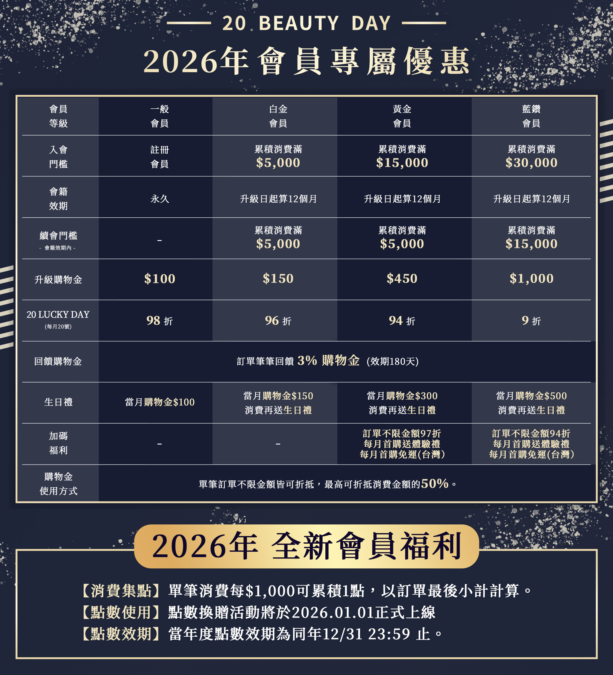 本會員制度及相關優惠僅限 20 BEAUTY DAY 官網會員使用,實際內容以系統與官網公告為準。20 BEAUTY DAY 保留隨時修改、終止本活動及制度內容之權利,修改後將公告於官網,恕不另行通知。購物金與點數等優惠具使用效期,請留意帳戶顯示資訊。