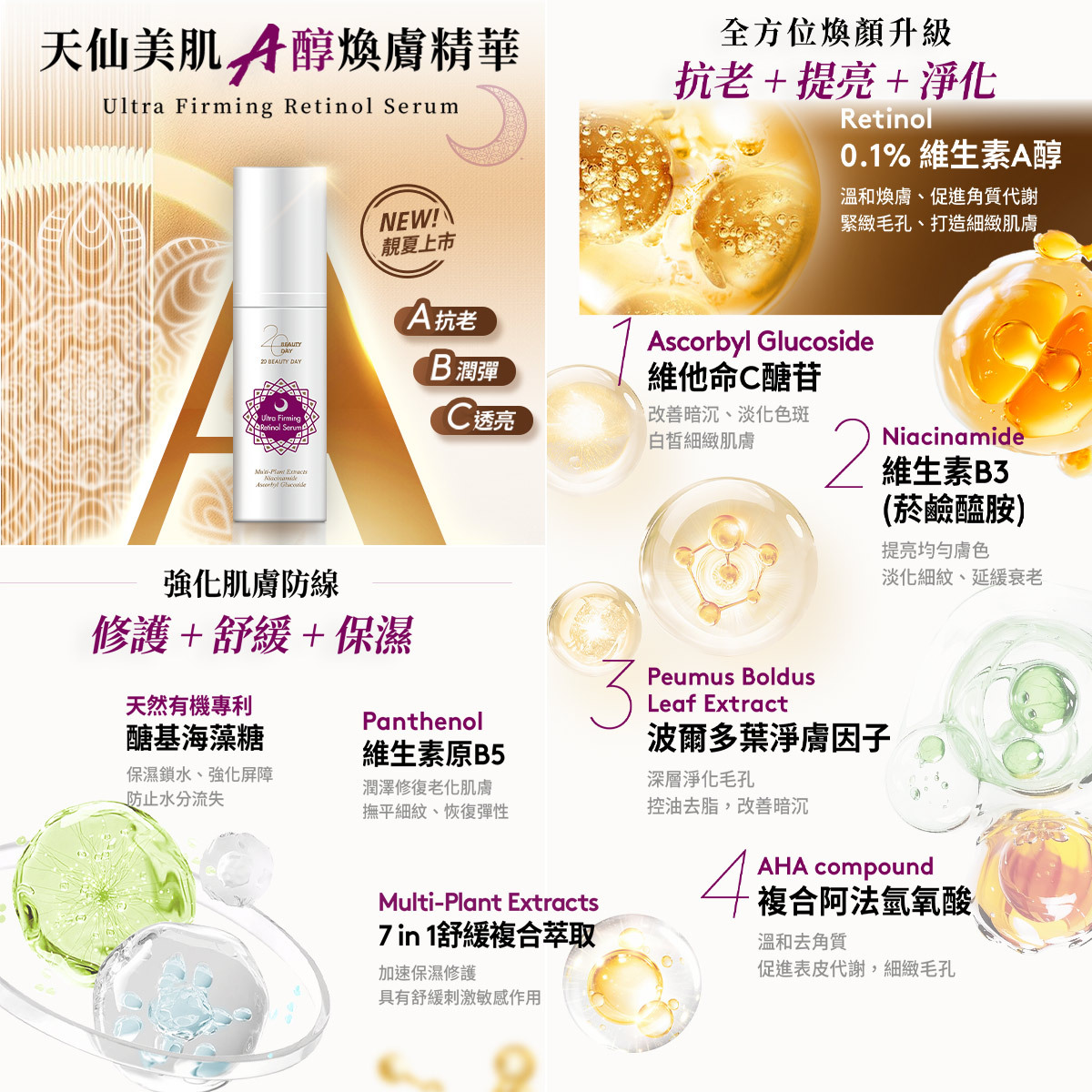 ABC黃金比例高效煥膚,溫和不刺激、無陣痛期,穩定膚況、撫紋提亮,打造極致仙女光。
