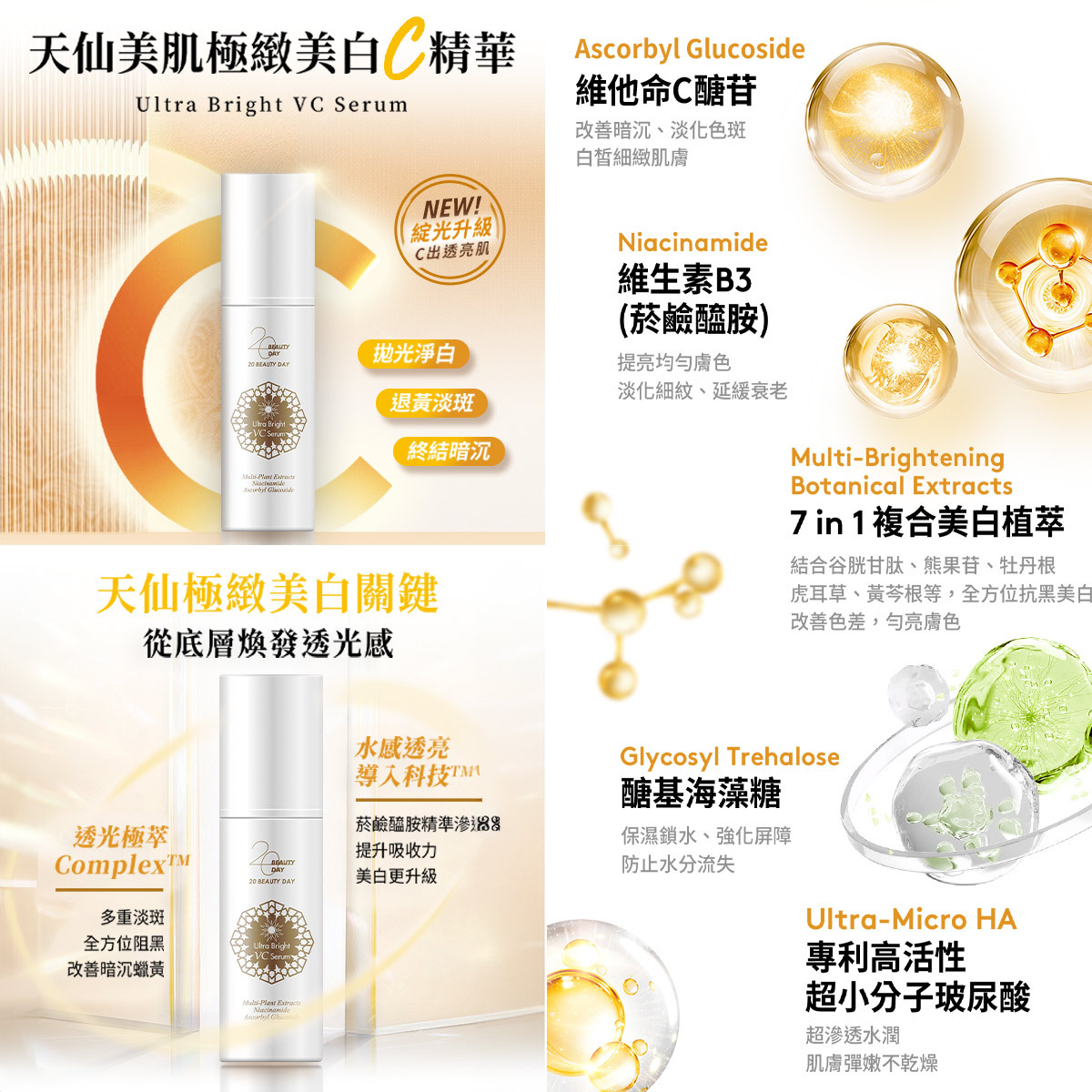 採用透光極萃Complex™,結合高濃度維他命C醣苷與7 in 1複合美白植萃,深入肌底釋放透亮能量,有效改善暗沉,使膚色勻淨透亮;以菸鹼醯胺搭載水感透亮導入科技™,使亮白能量更易吸收,讓肌膚散發自然光澤,綻放勻淨亮白的剔透美肌。