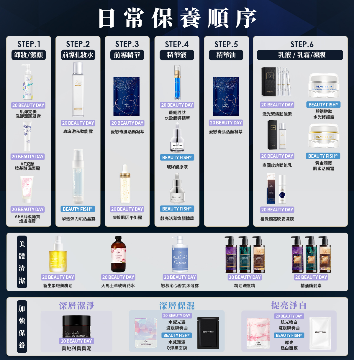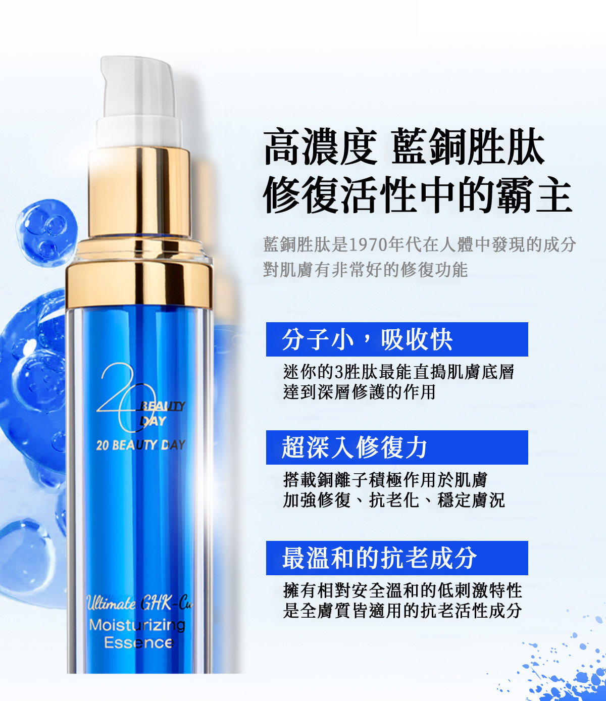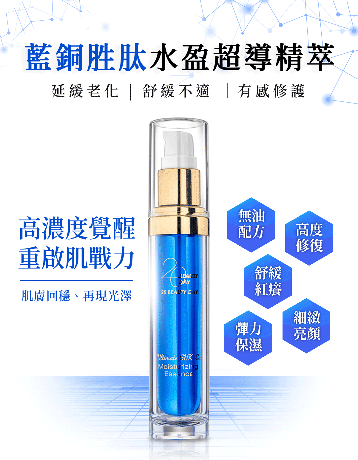 20 BEAUTY DAY 藍銅胜肽水盈超導精萃,蘊含高濃度藍銅胜肽及獨家六重玻尿酸精華,為肌膚注入豐盈水潤,密集補水,瞬透直達肌膚底層,即時舒緩肌膚乾荒,修護肌膚,延緩肌膚老化危肌,實現肌膚由內而外水潤細嫩豐盈質感,全膚質適用。 |