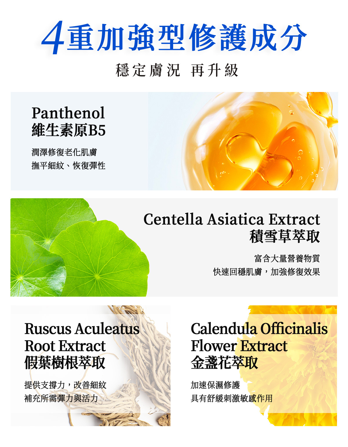 蘊含高濃度藍銅胜肽,迅速修護肌膚,緊實撫紋並延緩老化;獨家六重玻尿酸搭配Q彈活力寡肽、美白九胜肽及膠原三胜肽,加強改善暗沉,給予肌膚充滿活力的的彈力呵護,全方位延緩老化危肌,解緩不適問題,使肌膚更加倍緊緻澎潤,全膚質適用。