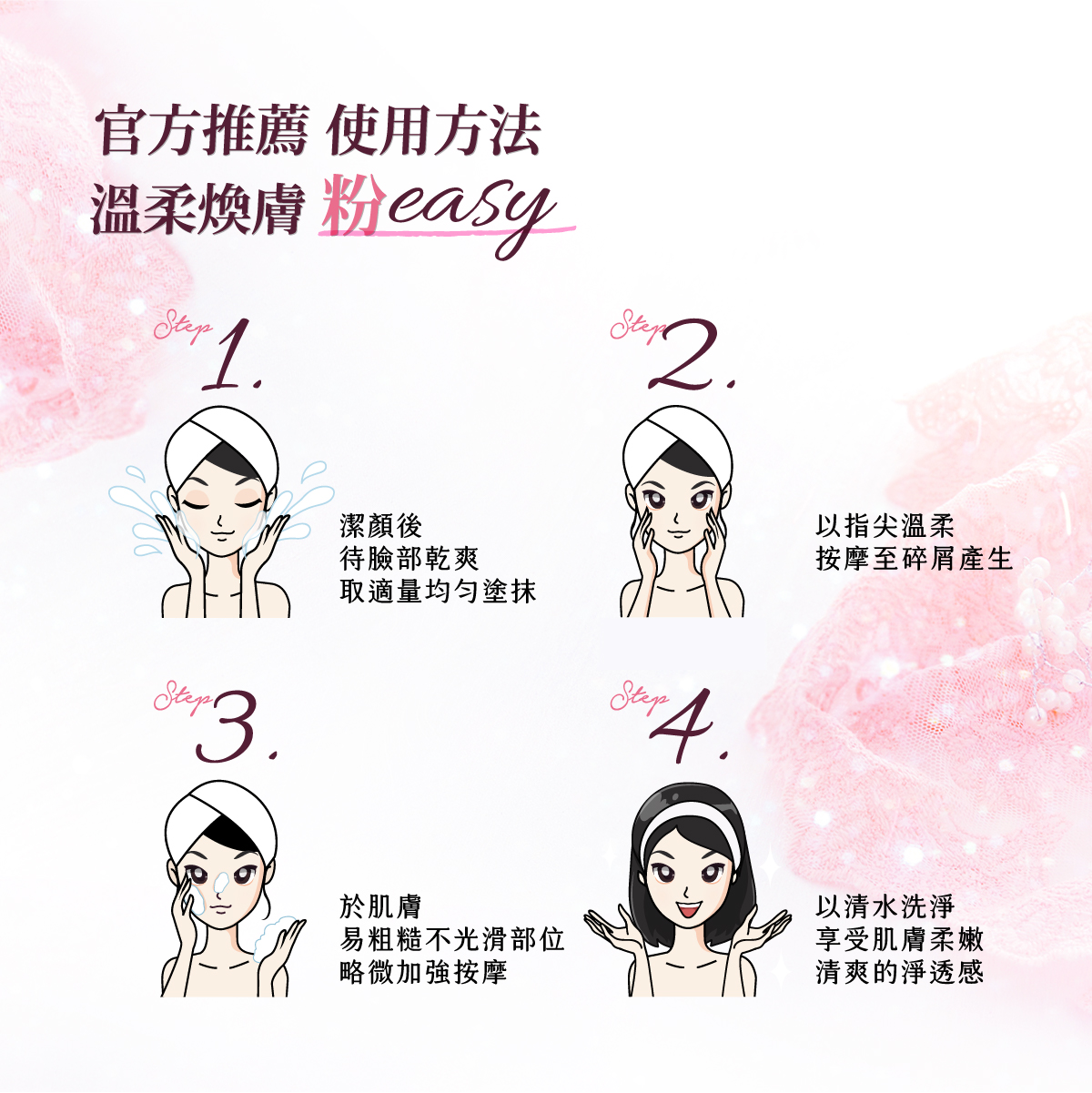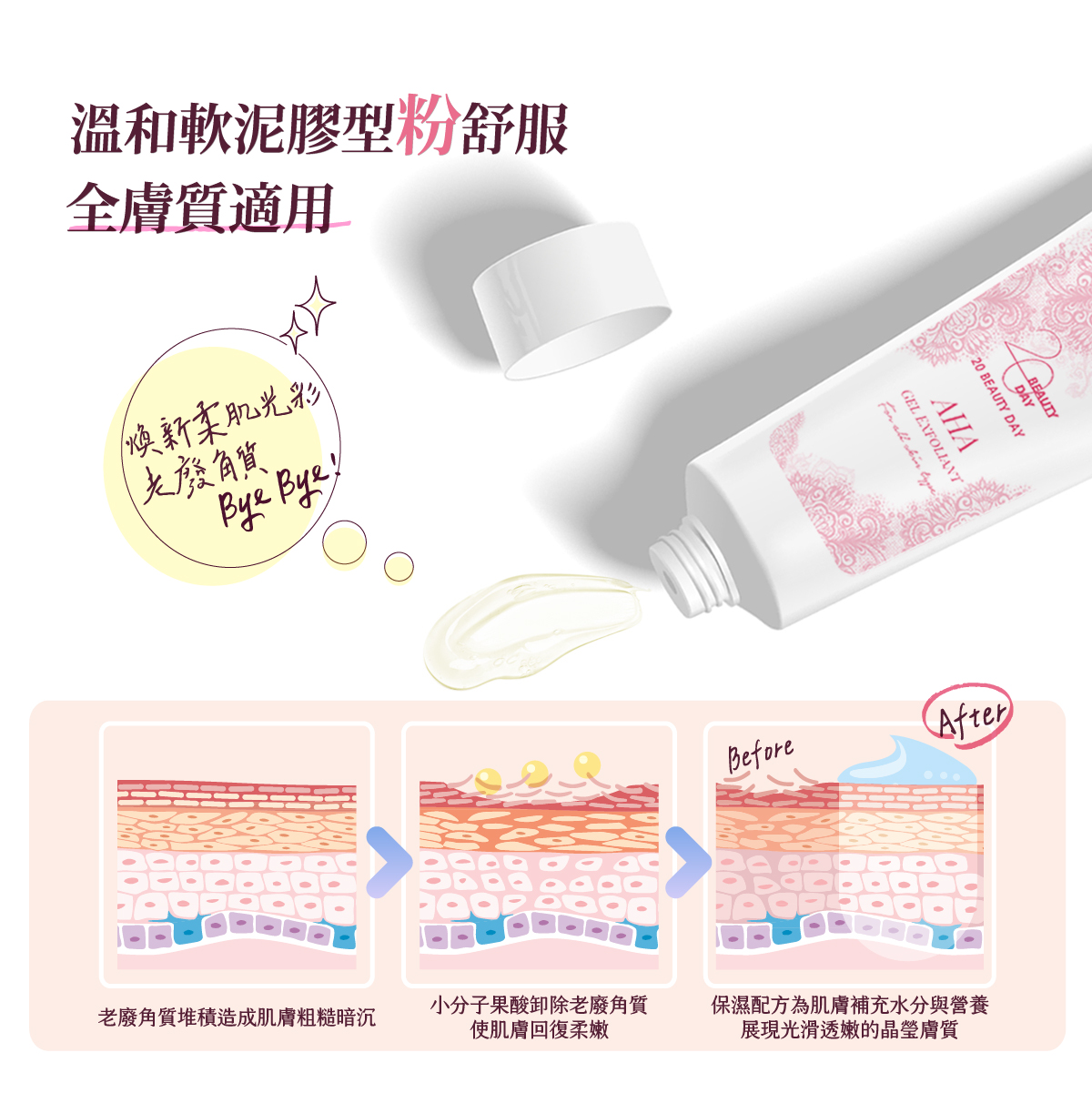 清潔臉部後,保持乾燥,取適量凝膠於手中,避開眼周與嘴角,輕輕按摩臉部及頸部肌膚一分鐘,再以清水洗淨即可。(身體肌膚亦適用)根據個人膚況不同,建議每週使用1~2次。 |