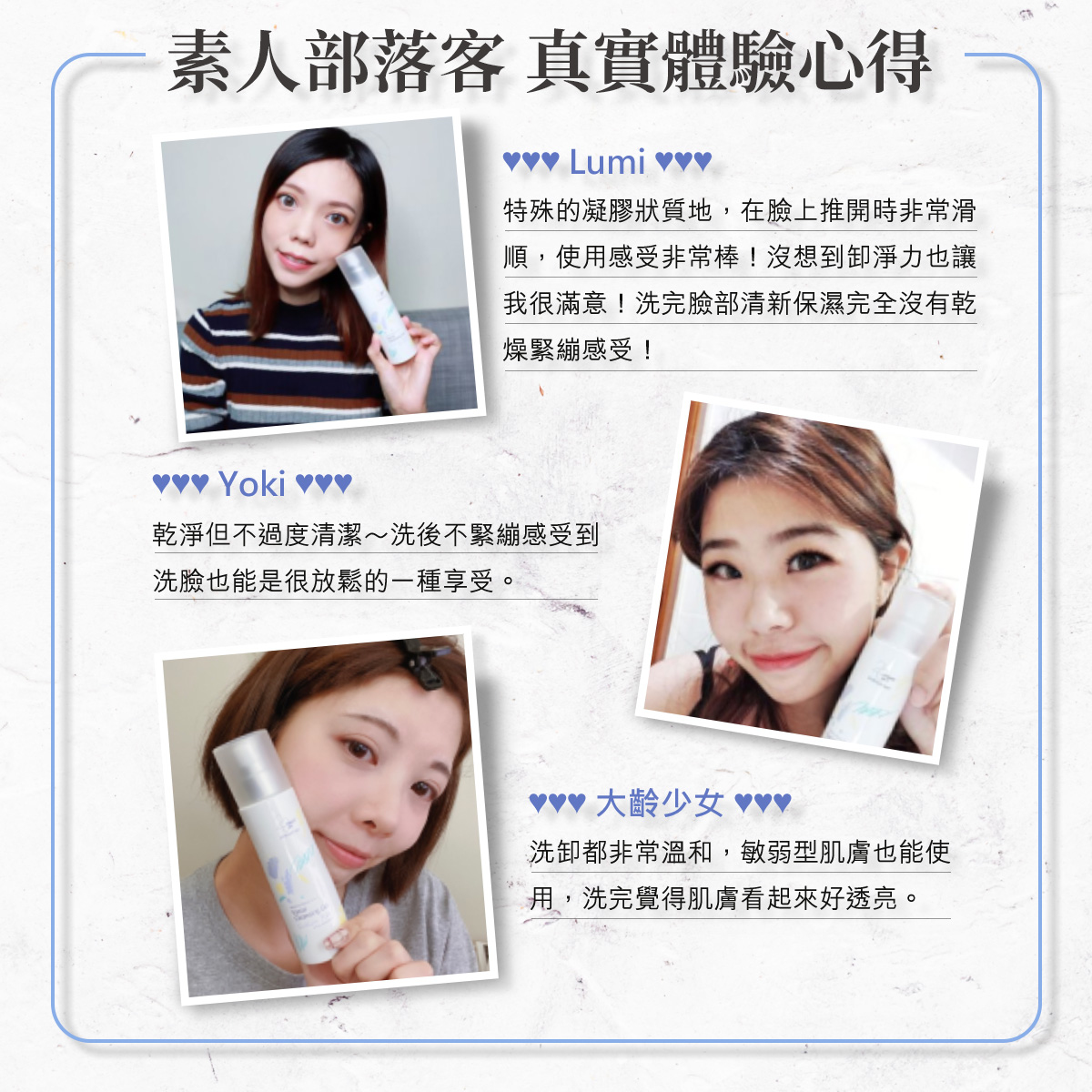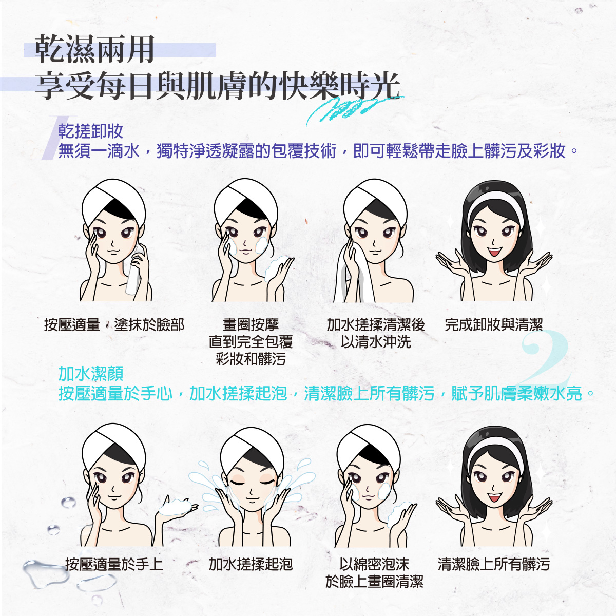 每次按壓4~5下,乾搓為卸妝/加水為洗臉,於面部輕輕打圈按摩,直到卸洗凝露完全包覆彩妝和髒污後,以清水沖洗,達到卸妝、洗顏、保濕三效合一的功效。 |