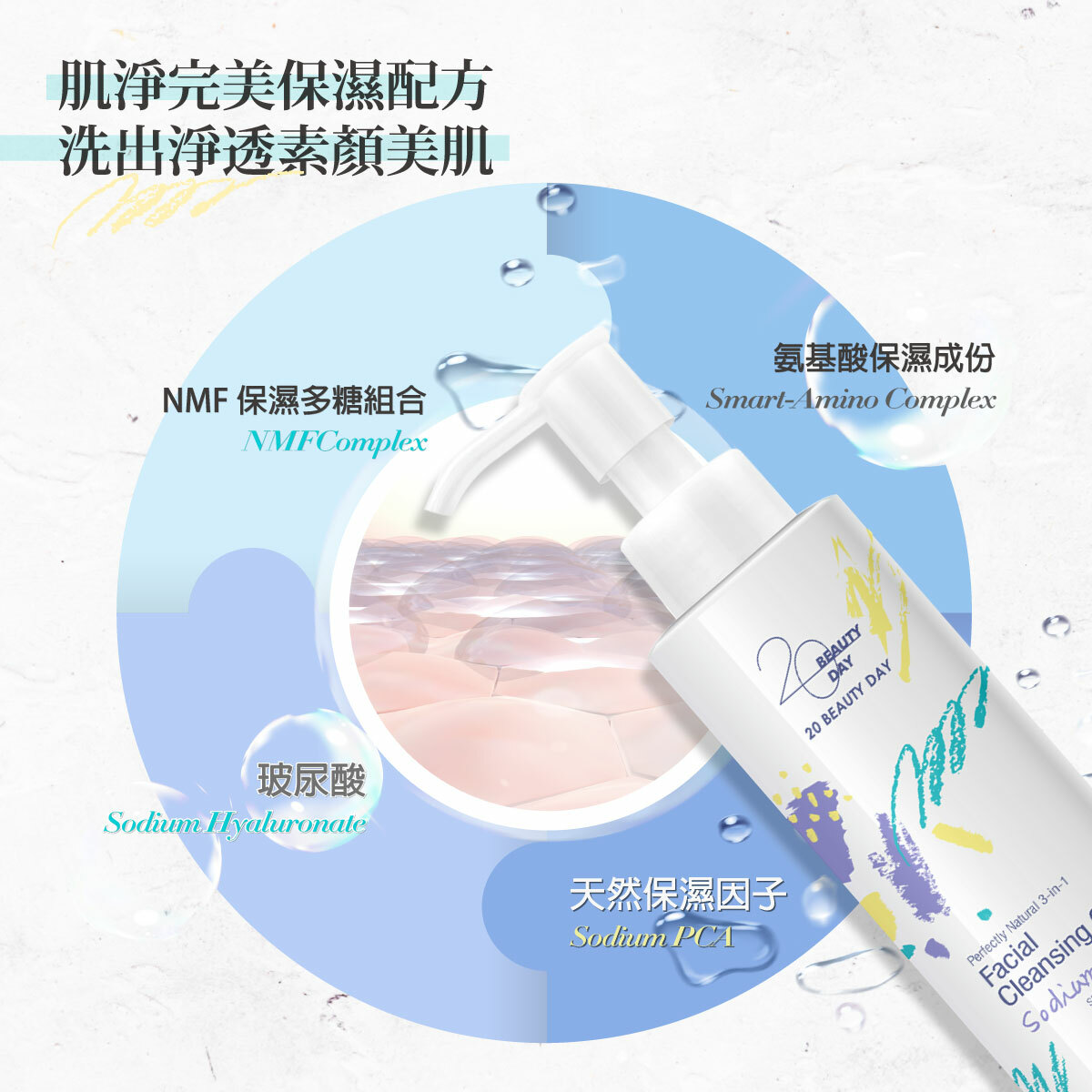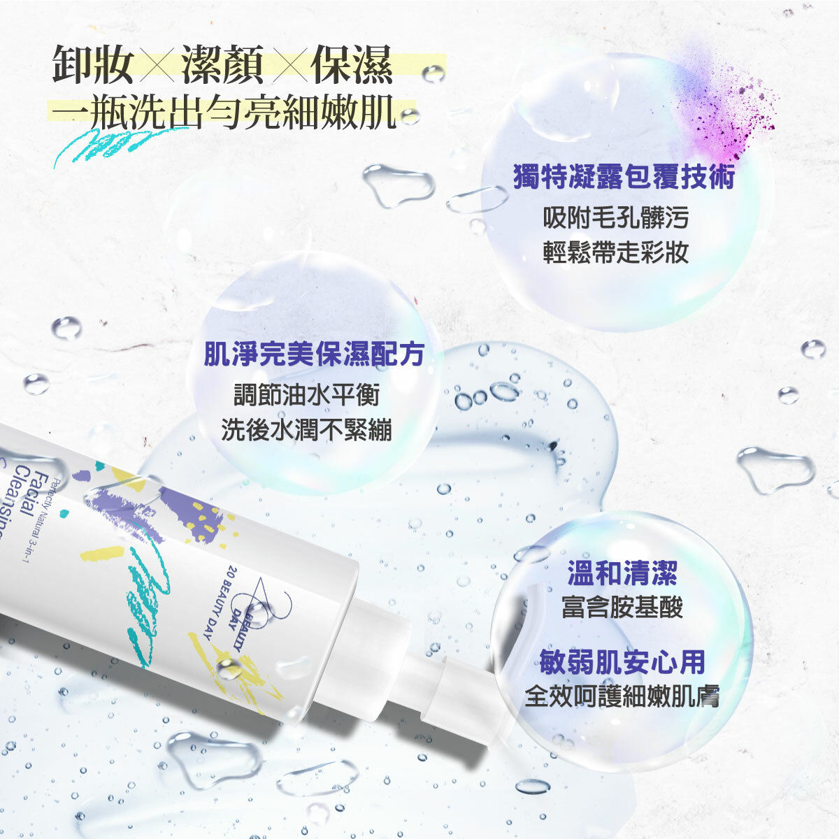 20 BEAUTY DAY 肌淨完美洗卸潔顏凝露,結合卸妝、洗顏、保濕三效合一配 方,獨特淨透凝露的包覆技術,能輕鬆帶走臉上髒污及彩妝;富含胺基酸及活性保濕成份,能溫和清潔卸妝,同時賦予肌膚清爽柔嫩膚觸,從清潔開始 為肌膚注入極緻保濕活力,洗出幾近完美淨透素顏美肌。 |