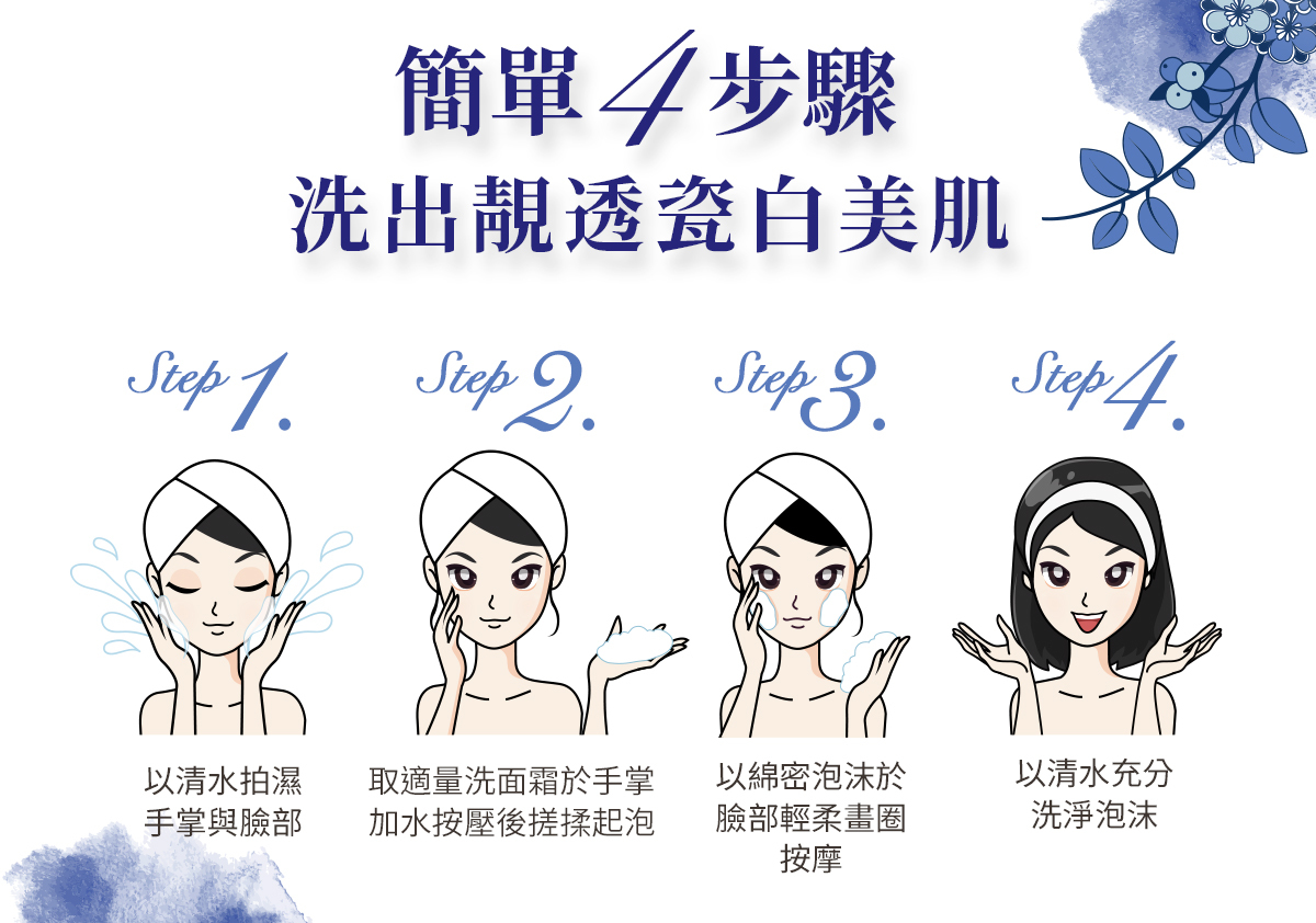 洗臉時,取適量至於掌心,加水揉出泡沫,將泡沫包覆全臉,輕柔按摩2~3分鐘,再用清水洗淨即可。 |