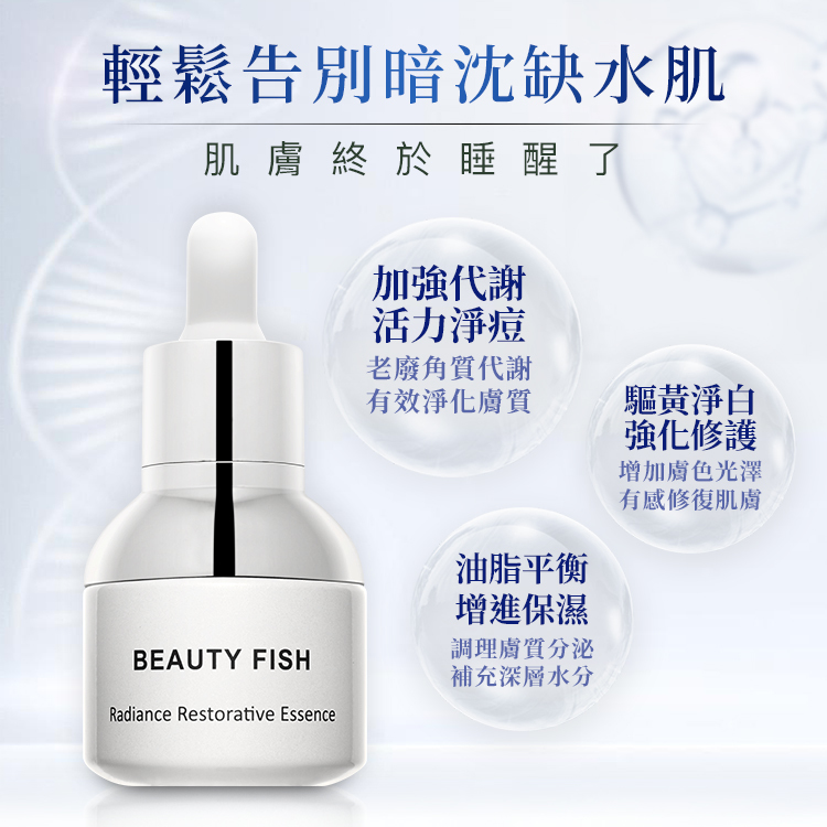 BEAUTY FISH®靚亮活萃煥顏精華匯萃三大活菌明星成分【活性比菲德氏益菌、釀酒酵母發酵濾液、南極深海冰川益菌】為高度進化活性益菌精華,能喚醒肌膚活力,加以驅黃淨白。為肌膚注入煥顏能量,平衡肌膚調節油脂分泌,加速肌膚老化角質的代謝,有效淨化毛孔;輕鬆告別暗沉缺水的疲憊肌膚,使肌膚從內而外煥發晶瑩、透亮無暇光彩。 |