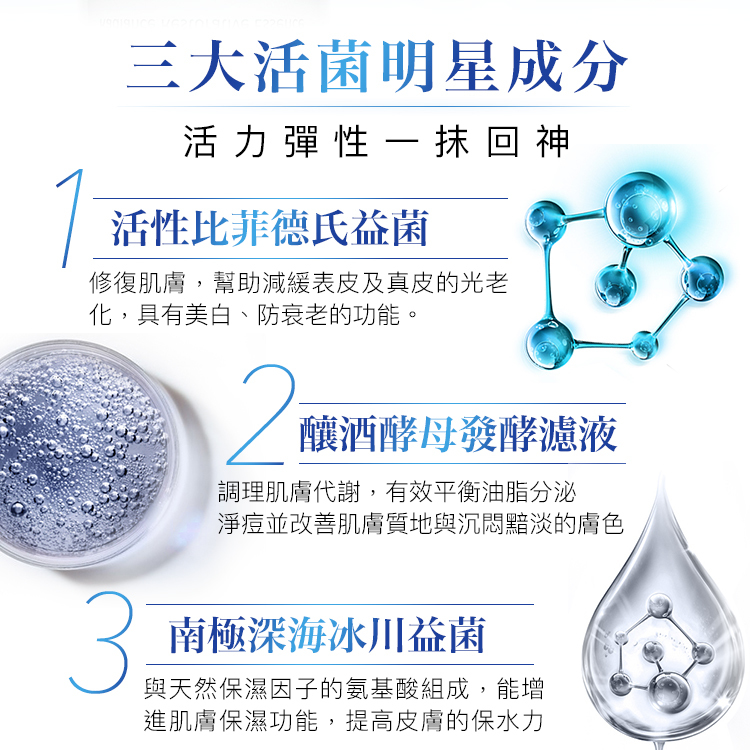 匯萃三大活菌明星成分【活性比菲德氏益菌、釀酒酵母發酵濾液、南極深海冰川益菌】,以高度進化活性益菌精華,平衡調節油脂分泌,加速老化角質代謝,有效淨化毛孔;輕鬆告別暗沉缺水的疲憊肌膚,注入煥顏能量,從內而外煥發晶瑩。