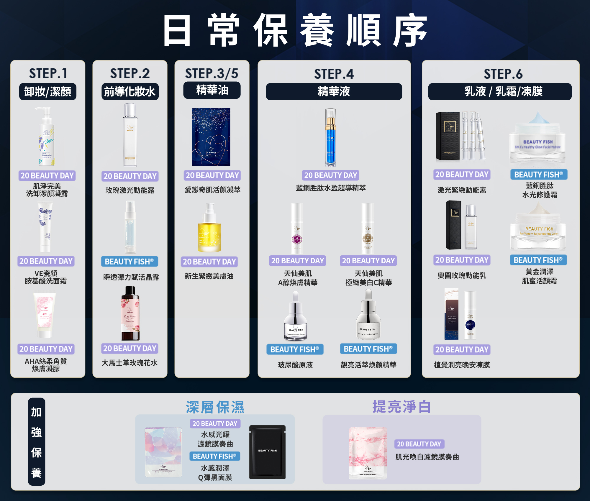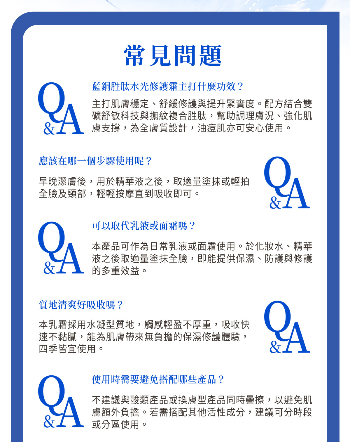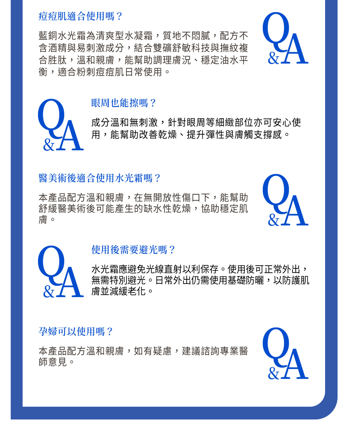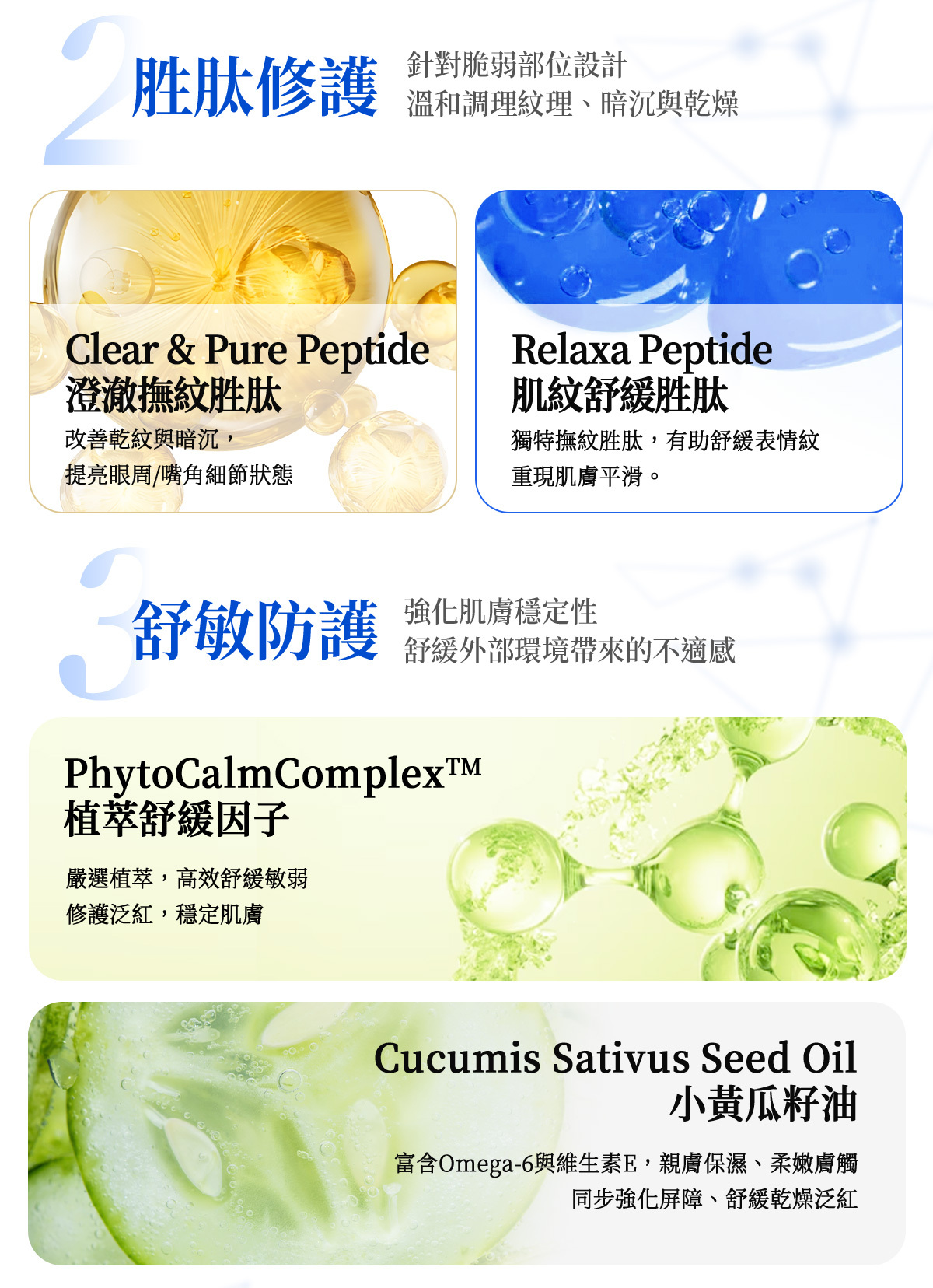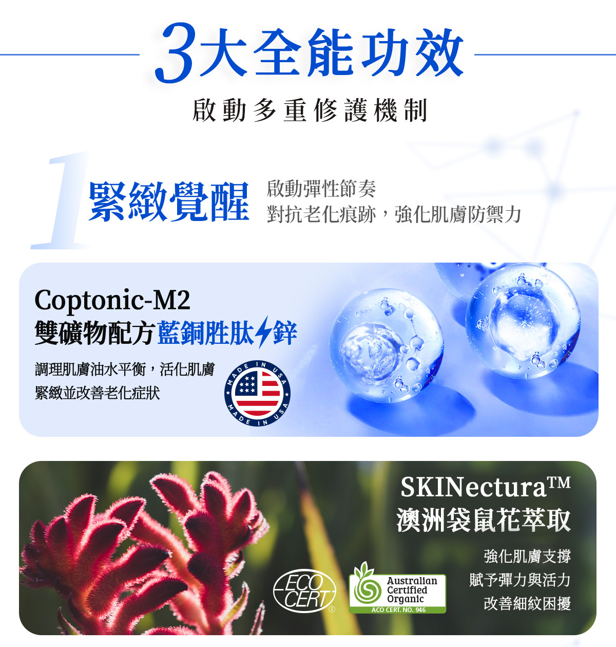| 藍銅胜肽、Coptonic-M2銅鋅雙礦物複合物、Hyalusil®、植萃舒緩因子、撫紋複合胜肽、澳洲袋鼠花萃取、小分子玻尿酸硅烷醇 |
