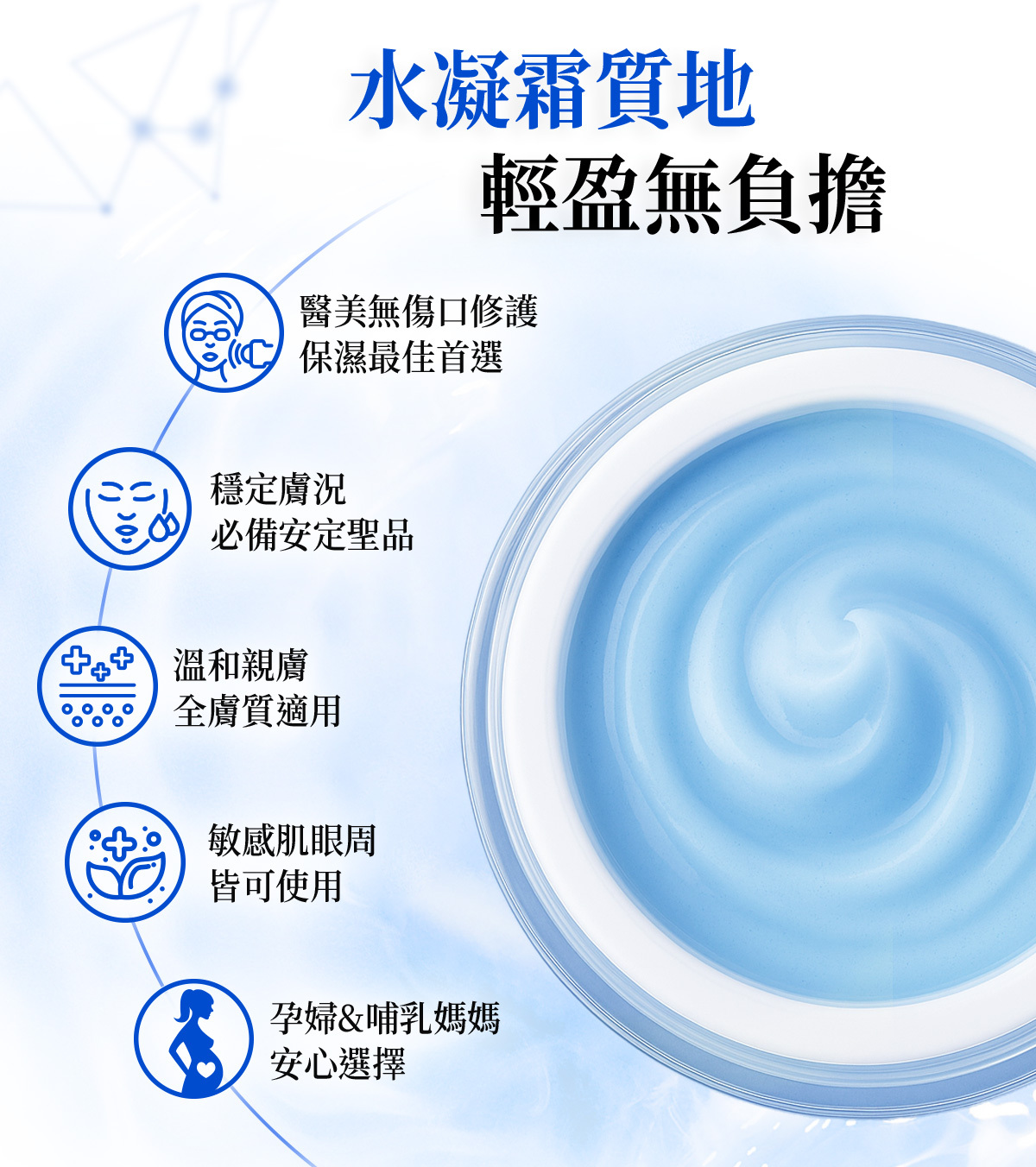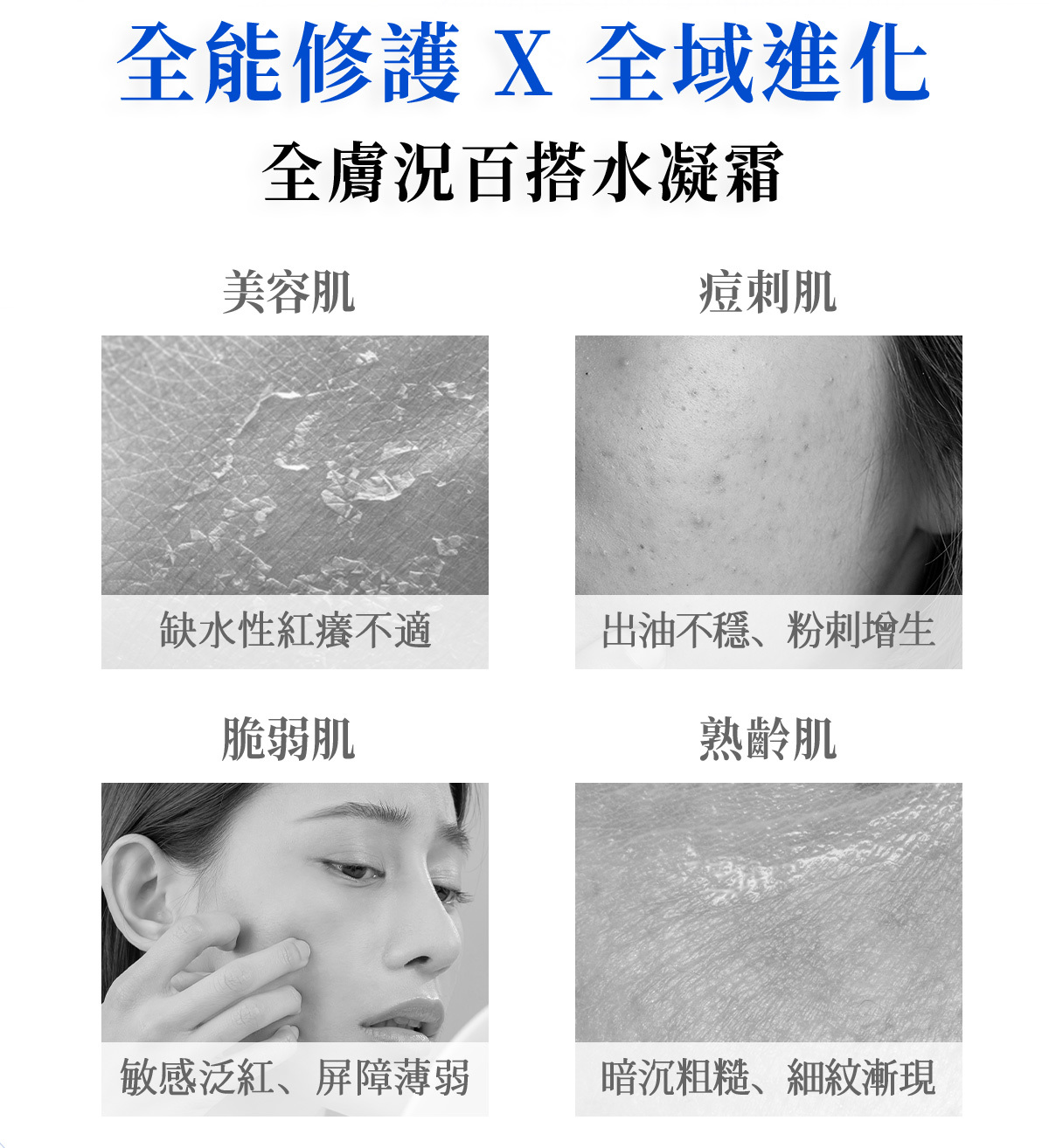 | 水光全能進化,搭載藍銅雙礦科技,結合撫紋複合胜肽與植萃舒緩因子,全面強化肌膚修護力與穩定機能,使膚觸澎彈緊緻、細紋淡化細紋。水凝質地清爽溫和,適用眼周等細緻部位,有助改善乾燥暗沉,綻放澄澈神采。日夜使用,穩定、修護、撫紋同步到位,打造健康透亮的理想膚況。 |