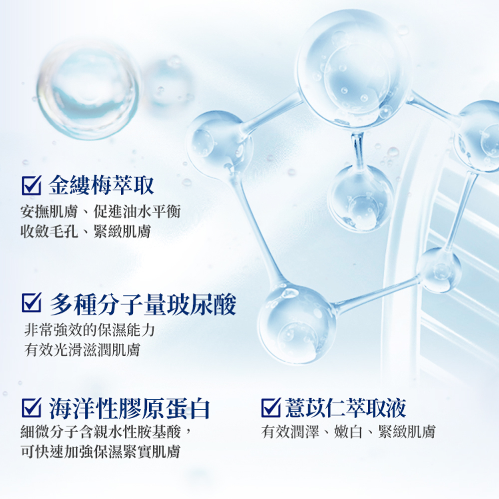 添加數10種生物工程技術萃取的植物精萃,以多重分子玻尿酸與膠原蛋白為基底,搭配複合型棕櫚脂類胜肽協同增效,幫助肌膚提升水潤保濕感,強化肌底彈力,使肌膚Q彈細緻,展現高效彈嫩的透亮光澤。。本產品不含酒精、香精、色素,安全溫和。