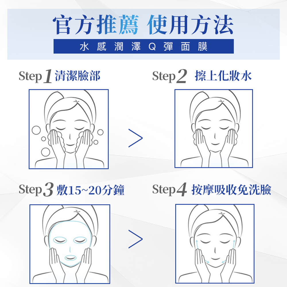 潔膚後擦上化妝水,取出面膜敷於全臉 15~20 分鐘後取下,用指尖輕拍精華液至吸收即可。使用後可不需用水清洗。 |