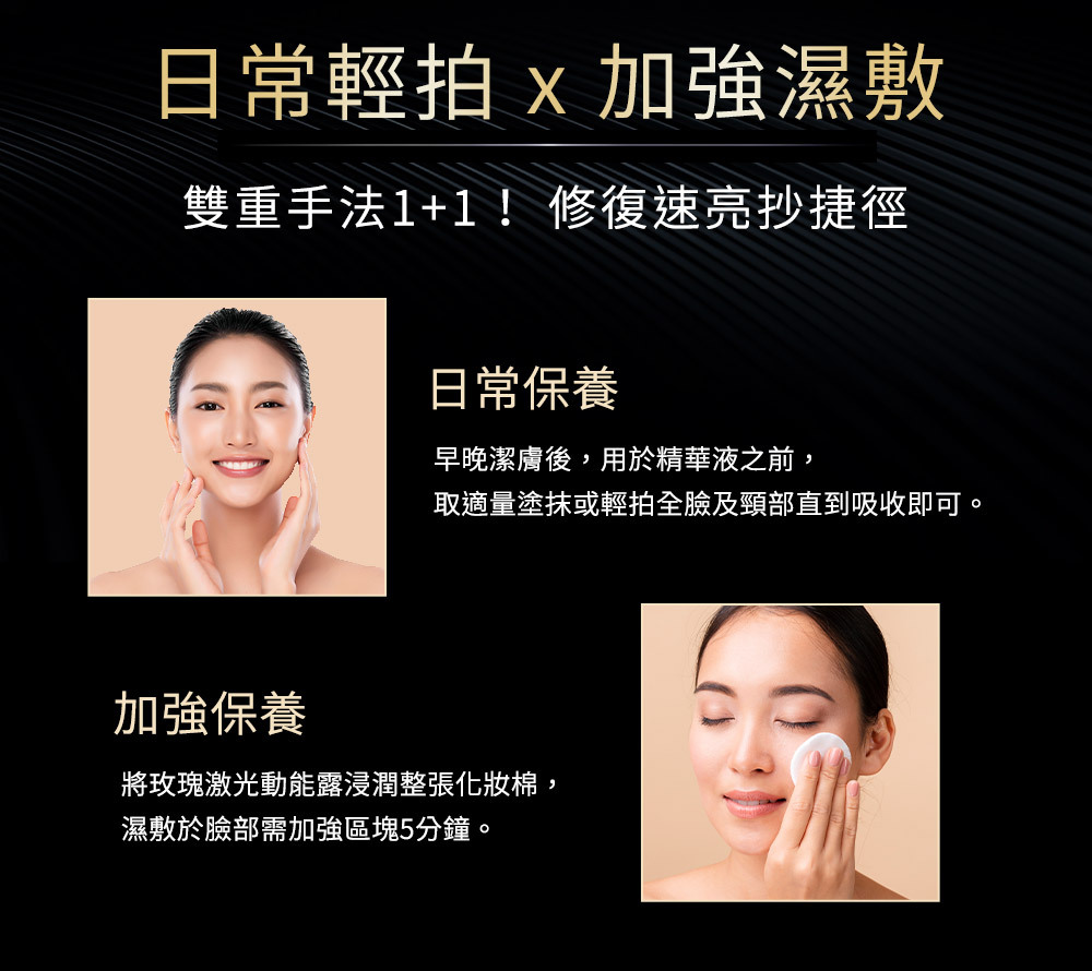 【加強保養】將玫瑰激光動能露浸潤整張化妝棉,濕敷於臉部需加強區塊5分鐘。
