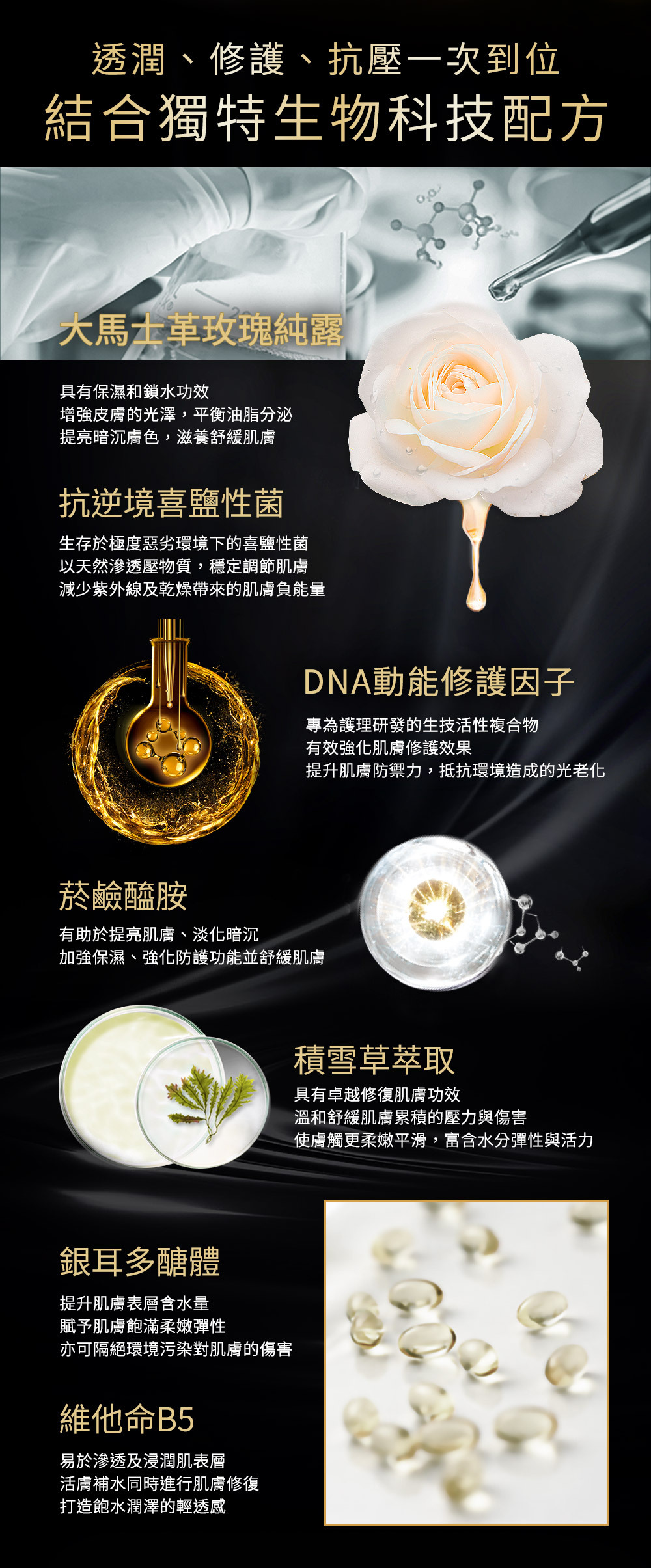 以香氣馥郁的大馬士革玫瑰純露為基底,結合「抗逆境喜鹽性菌」與獨特生物科技「DNA動能修護因子」,為肌膚抵禦惡劣環境與光老化,有效舒緩亮白肌膚並深度修護調理膚質,迅速賦活肌膚能量,喚醒沈睡肌活力,使肌膚飽含潤澤,蘊含清爽透晰光感。