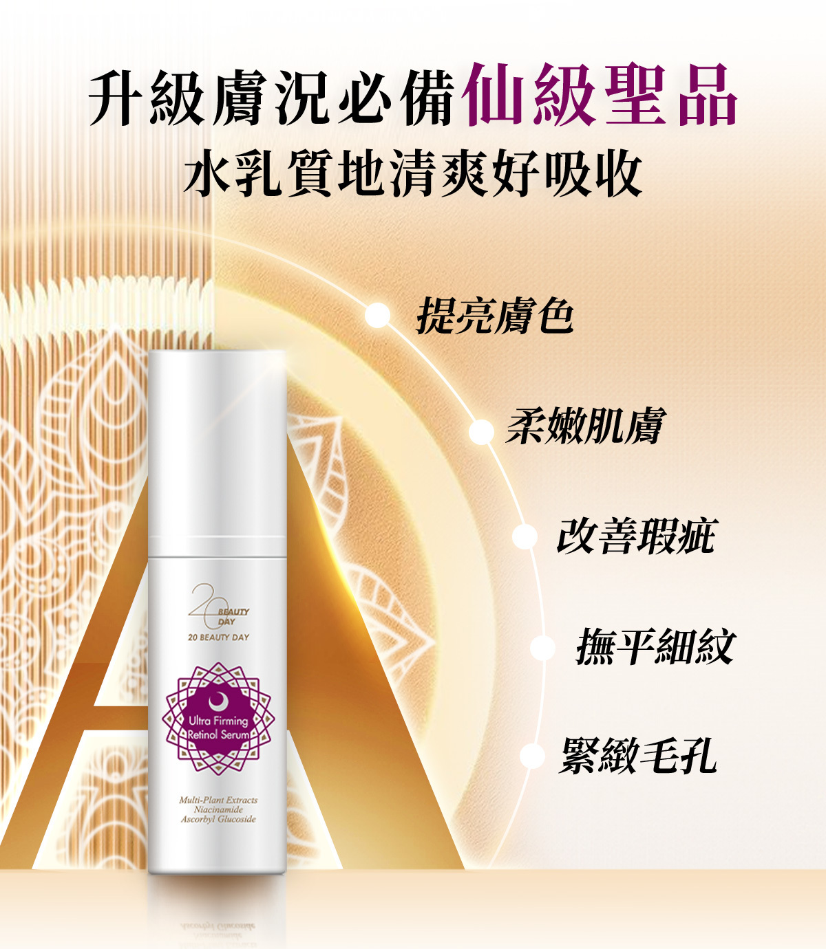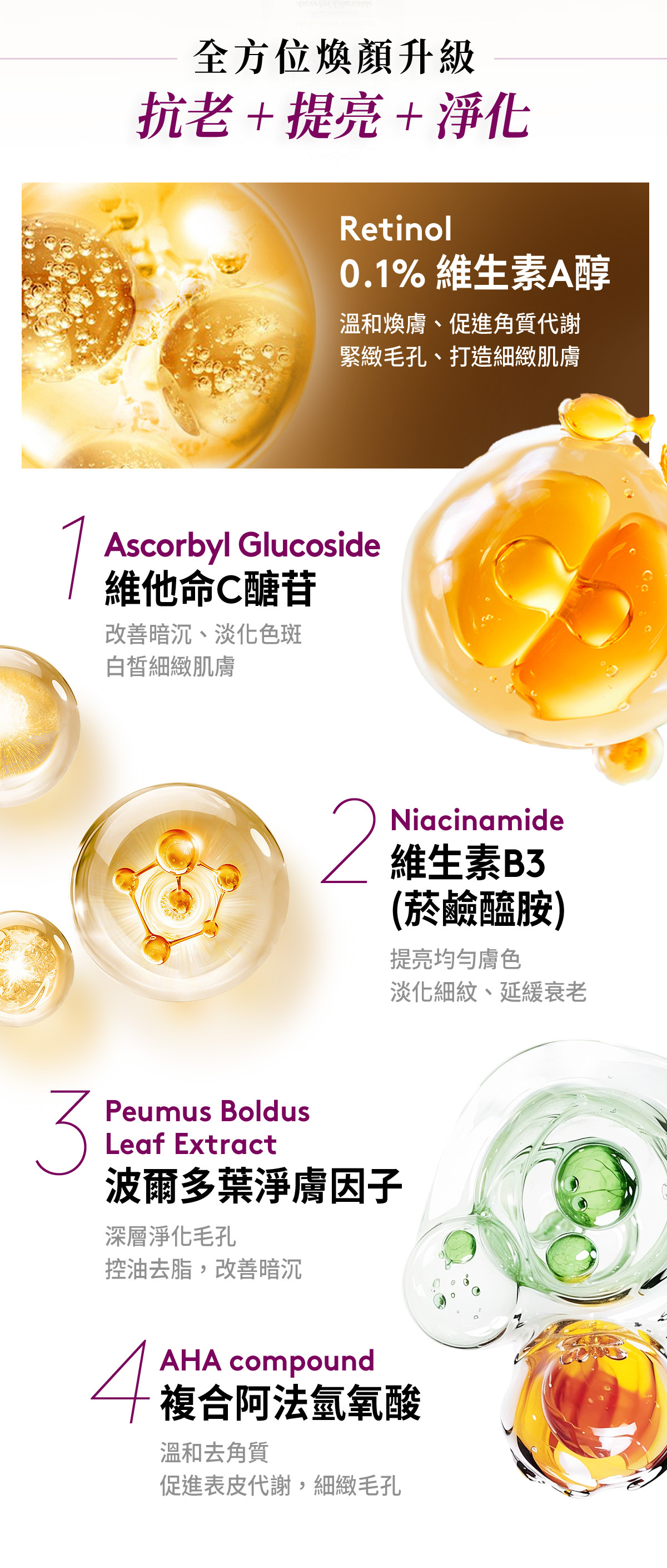以明星級0.1%A醇活性成分為核心,全方位對抗老化跡象,撫平肌膚細紋並維持彈性活力;獨特結合雙B配方及維生素C醣苷,提供多重防護,有效淡化色斑、勻亮膚色,同時淨化瑕疵,打造淨透彈嫩光澤肌。 |