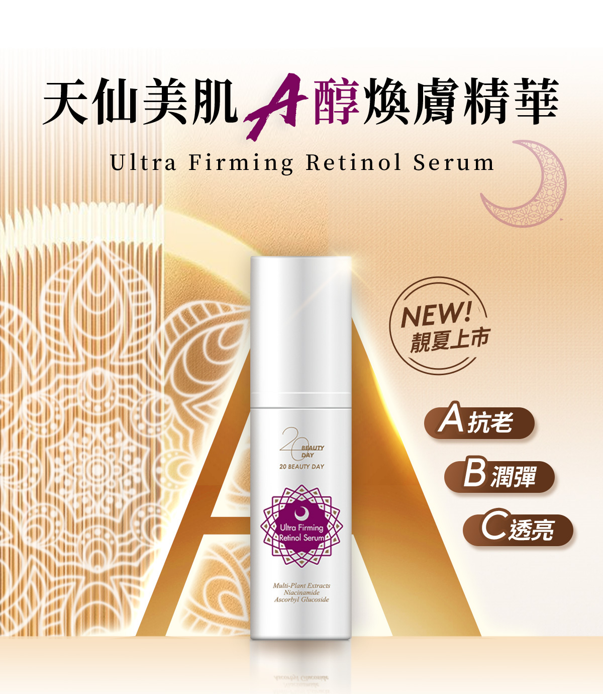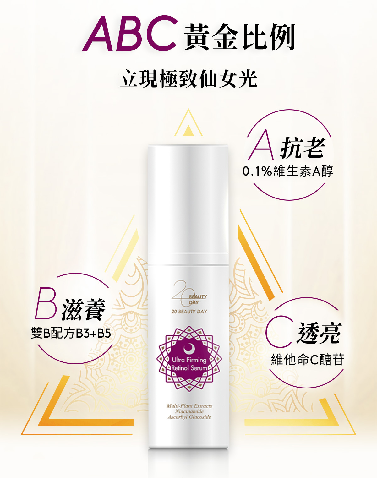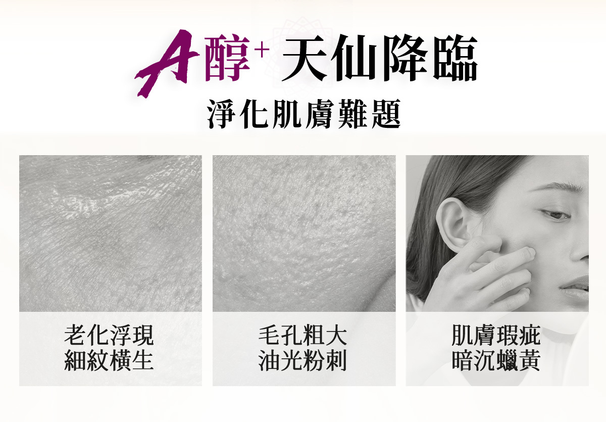 以明星級0.1%A醇活性成分為核心,全方位對抗老化跡象,撫平肌膚細紋並維持彈性活力;獨特結合雙B配方及維生素C醣苷,提供多重防護,有效淡化色斑、勻亮膚色,同時淨化瑕疵,打造淨透彈嫩光澤肌。