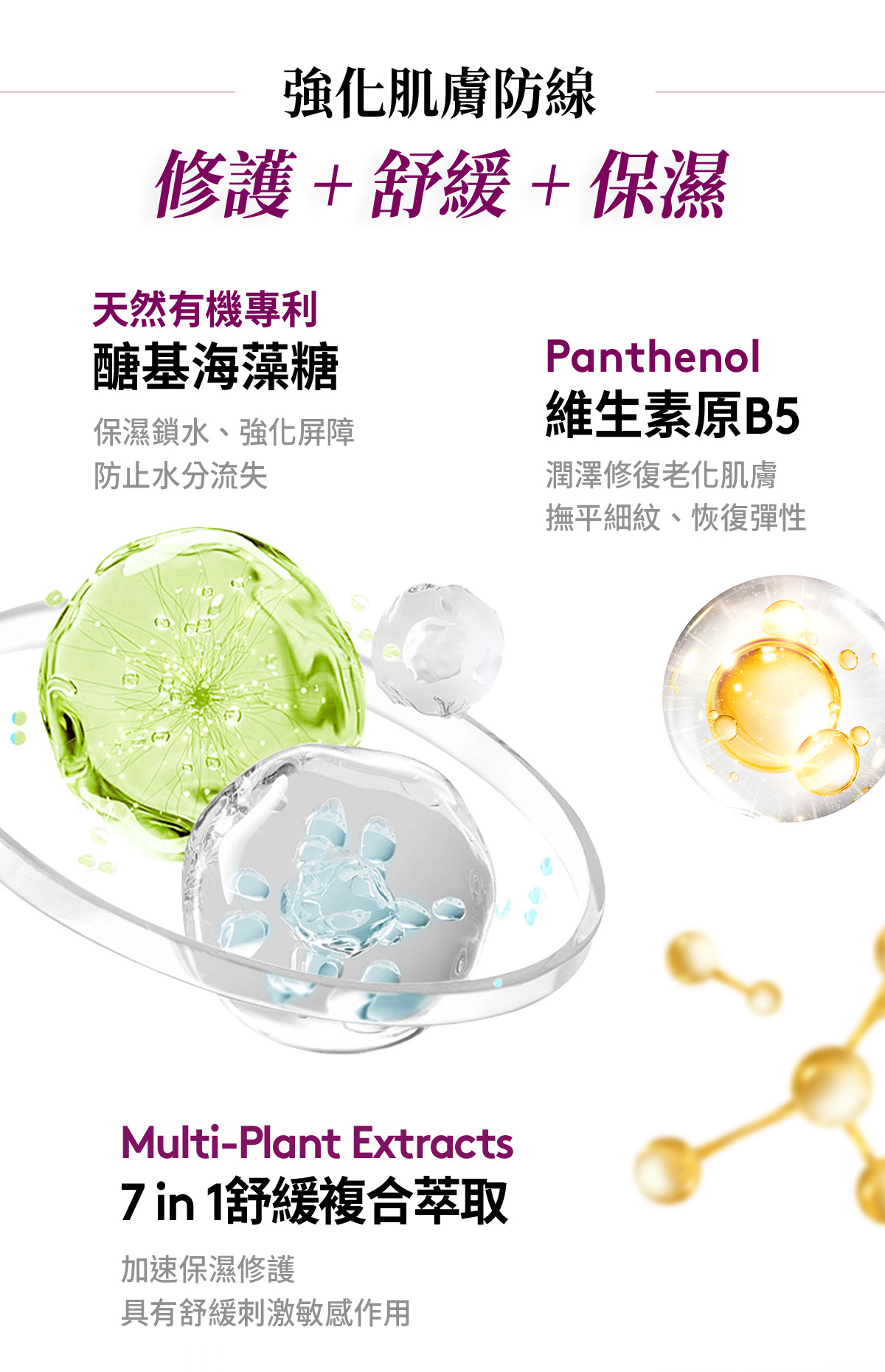 維生素A醇、維生素B3(菸鹼醯胺)、維生素B5、波爾多葉淨膚因子、7 in 1舒緩複合萃取、複合阿法氫氧酸、維他命C醣苷、天然有機專利醣基海藻糖 |