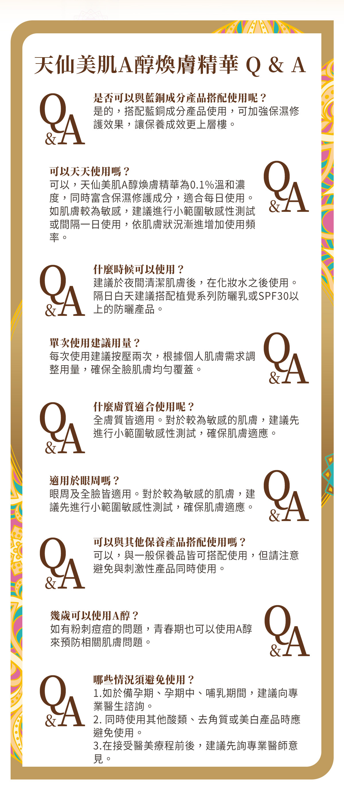 本產品含有A醇,孕婦及哺乳期、備孕期請勿使用。 建議於晚間使用並於隔日早晨加強肌膚防曬。 使用前請先在小範圍進行敏感性測試。本產品僅供外用,使用期間如有不適,請立即停用並尋求醫生協助。如不慎接觸眼睛,請立即用大量清水沖洗。 |