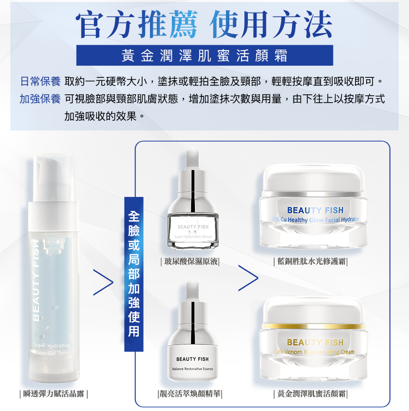 BEAUTY FISH®黃金潤澤肌蜜活顏霜,獨特 Wuxyl®修護胜肽技術,集結蜂王漿、蜂蜜、蜂膠、蜂毒胜肽等高效活膚成分,可淡化細紋,緊緻臉部肌膚,持續有效修護改善膚質,締造緊緻透亮的活顏美肌;同時搭配具有完美 Omega 比例的多種植物油以及豐富多元的維他命元素,增效強化肌膚保水力及抗老化,達到緊緻活膚、潤澤活顏的功效。 |