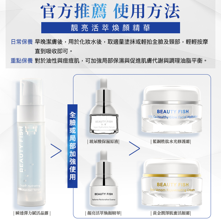 BEAUTY FISH®靚亮活萃煥顏精華匯萃三大活菌明星成分【活性比菲德氏益菌、釀酒酵母發酵濾液、南極深海冰川益菌】為高度進化活性益菌精華,能喚醒肌膚活力,加以驅黃淨白。為肌膚注入煥顏能量,平衡肌膚調節油脂分泌,加速肌膚老化角質的代謝,有效淨化毛孔;輕鬆告別暗沉缺水的疲憊肌膚,使肌膚從內而外煥發晶瑩、透亮無暇光彩。 |