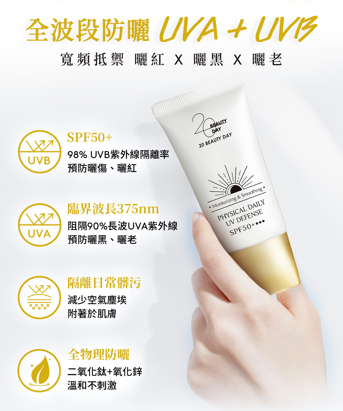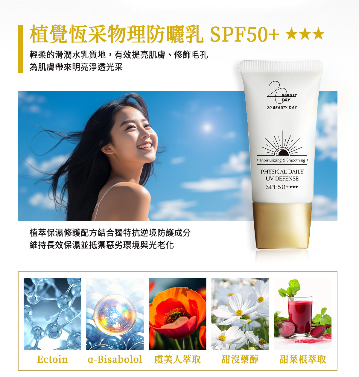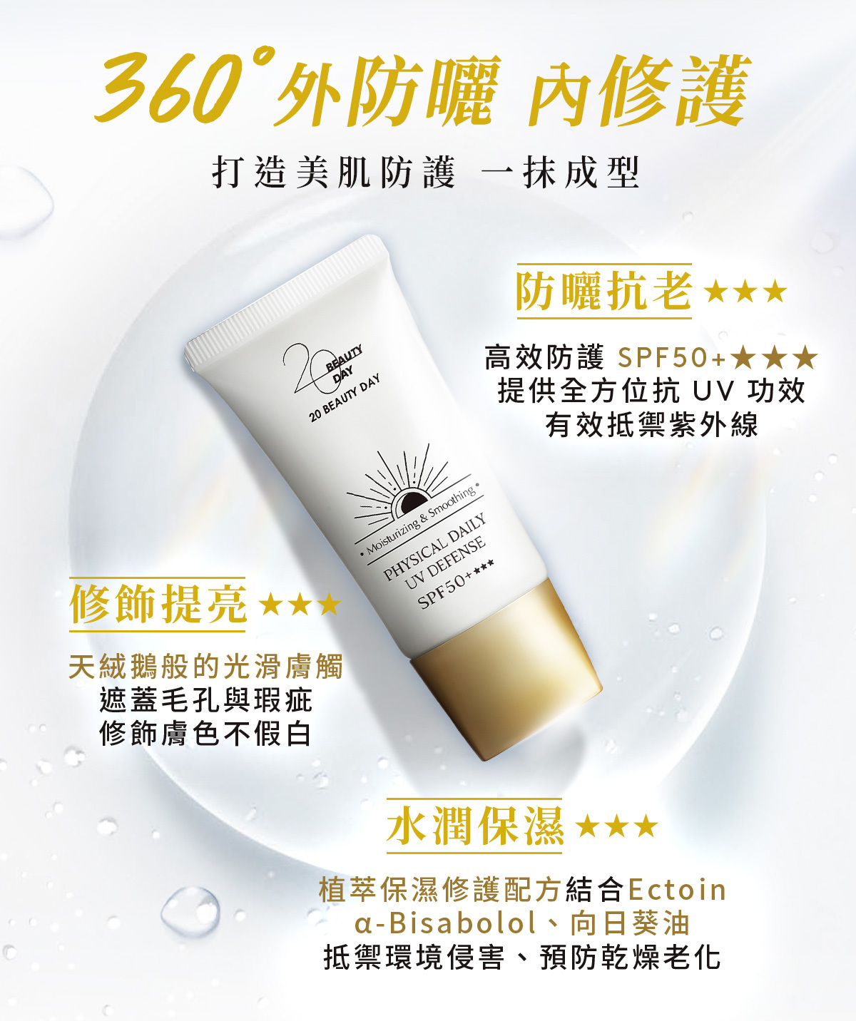 提供SPF50+★★★ 全物理高規格防曬,提供全方位抗UV功效,有效抵禦紫外線。蘊含植萃保濕修護配方結合獨特抗逆境防護成分,維持長效保濕並抵禦惡劣環境與光老化;清爽水潤的輕柔質地,有效提亮肌膚、修飾毛孔,為肌膚帶來明亮淨透光采。